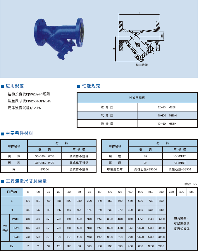 德標Y型過濾器DIN3202-F1系列結構長度標準;DIN2531-2545法蘭標準;殼體強度試驗為1.5*PN。