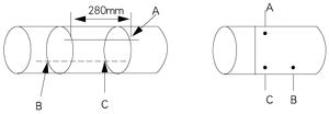 | 將定位紙纏繞在已表面清理干凈的管道上,注意要把紙兩邊互相重合對齊,才能使所劃的線與管軸相平行; |