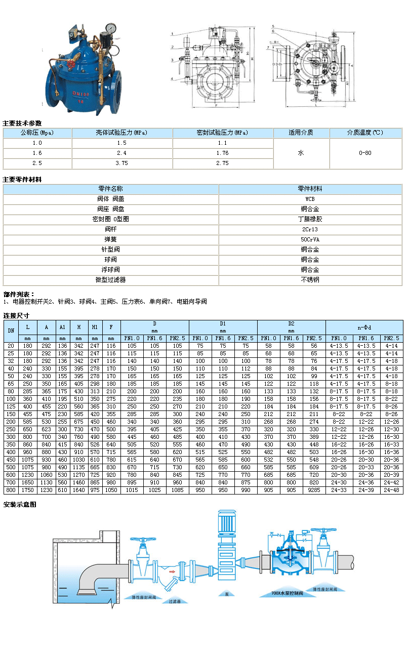700X多功能水泵控制閥由主閥、電磁導閥、針閥、球閥、單向閥、行程開關、微形過濾器和壓力表組成水力控制接管系統。水泵需停止工作時,先由進口壓使主閥關閉90%后,水泵停止運轉。剩余10%由回水關閉。可防止水錘現象發生。本產品利用電磁導閥控制,不需要其它裝置和能源。節約能源,保養簡便,停泵平穩。電磁閥可采用交流電220V或直流電24V。本系列閥門產品廣泛用于高層建筑、生活區等供水管網系統及城市供水工程。當水泵工作閥門向下游供水時,電磁導閥全開,針閥調至適當開度,上游水經針閥、單向閥進入主閥控制室,經電磁導閥流出,此時主閥控制室的壓力保持主閥處于合適的開度,保持下游正常供水。當水泵停止工作時,電磁導閥先關閉,主閥控制室停止排水,控制室壓力升高,主閥開始關閉。當關閉至90%時,主閥上部行程開關輸出停泵信號,水泵停止運轉。此時下游回水經單向閥進入主閥控制室,控制室壓力升高,主閥被關閉。 |