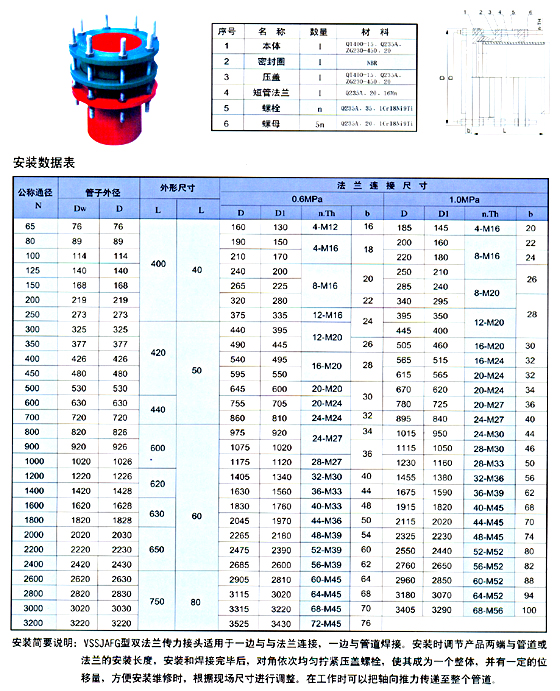 | VASSJAFG型單法蘭傳力接頭CF(VSSJAFG)單法蘭傳力接頭直接與管路焊接,其作用與特點(diǎn)同C2F(VSSJAF)。該產(chǎn)品適用于一邊與法蘭連接一邊與管子連接的管路中,安裝時(shí)調(diào)節(jié)產(chǎn)品兩端與法蘭的安裝長度,對(duì)角座均勻擰緊壓蓋螺,使其成為一個(gè)整體,并有一定的位移量,方便安裝維修時(shí),根據(jù)現(xiàn)場尺寸進(jìn)行調(diào)整。在工作時(shí)可以把軸向推力傳遞至整個(gè)管道。這樣不僅提高工作效率,而且對(duì)泵設(shè)備起到一定保護(hù)作用。